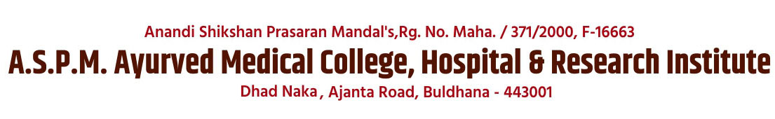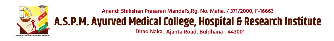 ASPM ayurved college hospital and research institute buldhana established in 2011. First batch was admitted in 2014. It is located at ajantha road in buldhana city. The college has 60 ug intake capacity. The college is recognised by ccim, ministry of ayush new delhi and affiliated to muhs nashik. The college has 14 well equipped department with library.The college has experience teaching staff to serve the students and patients. The college runs 100 beded hospital with OPD and IPD section. The hospital gives best ayurveda panchkarma, kasharsutra, yoga facilities to the surrounding people.
